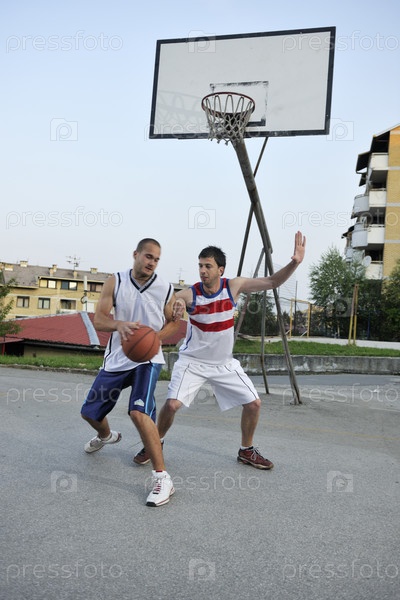 Двое молодых людей ранним утром играют в стритбол