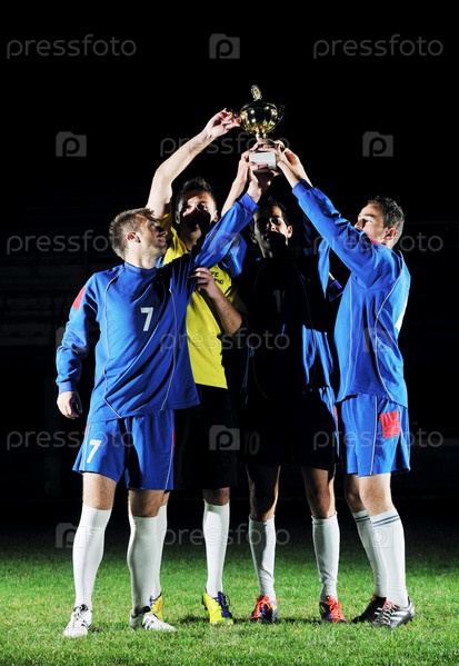 Футбольная команда с кубком на поле