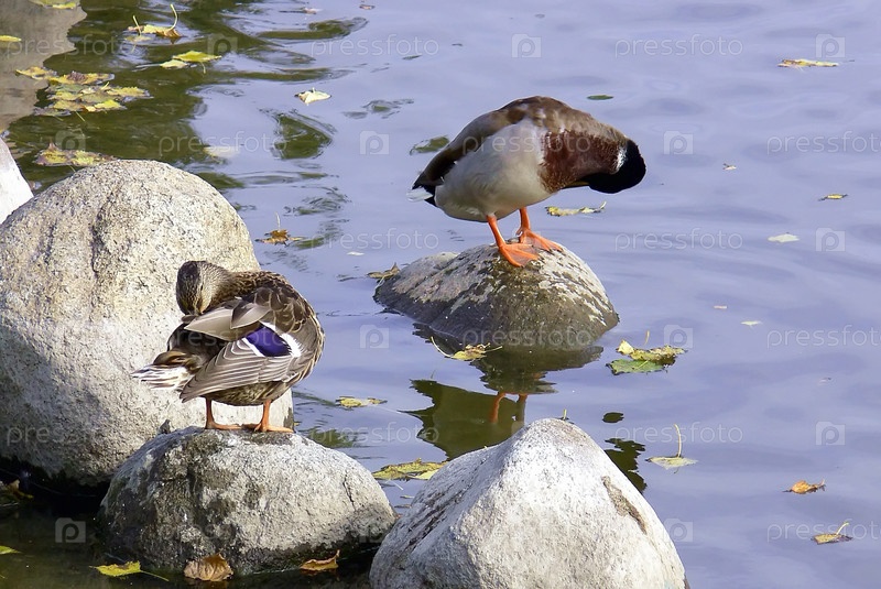 Утки умываются на камнях в воде