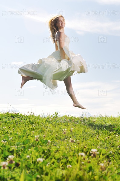 Красивая невеста в прыжке на лугу