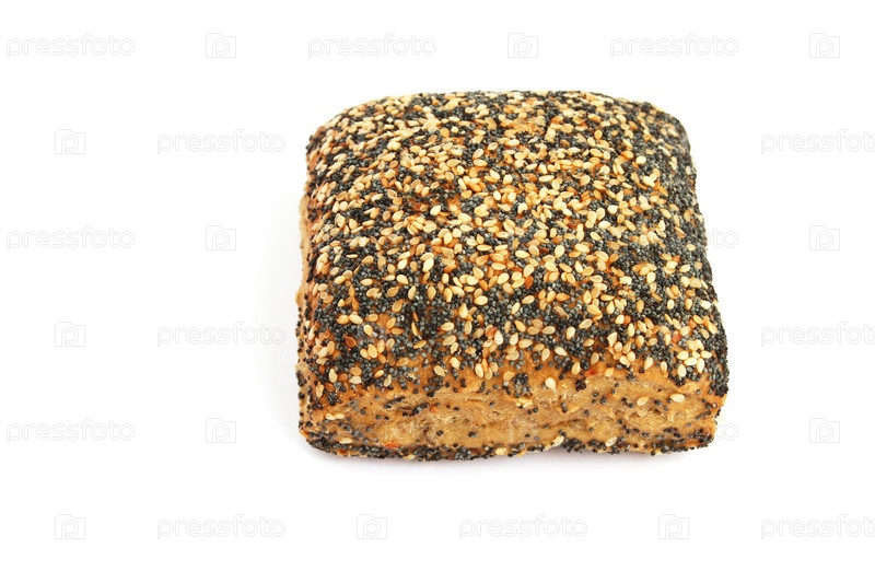 Булочка с кунжутом и семенами мака на белом фоне
