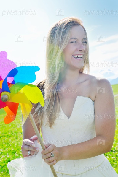 Счастливая молодая красивая невеста развлекается на лугу на закате после свадебной церемонии