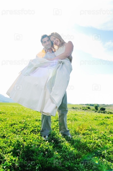 Счастливые жених и невеста гуляют по полю на закате после свадебной церемонии