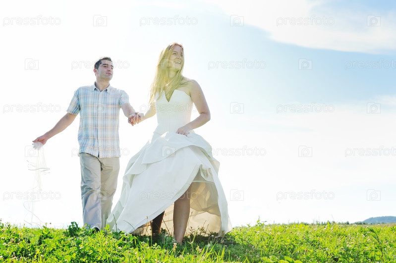 Счастливые жених и невеста гуляют по полю на закате после свадебной церемонии