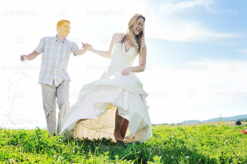 Счастливые жених и невеста гуляют по полю на закате после свадебной церемонии