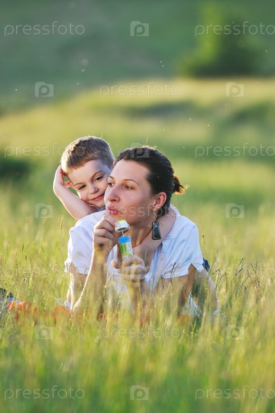 Счастливые ребенок и женщина пускают мыльные пузыри на лугу