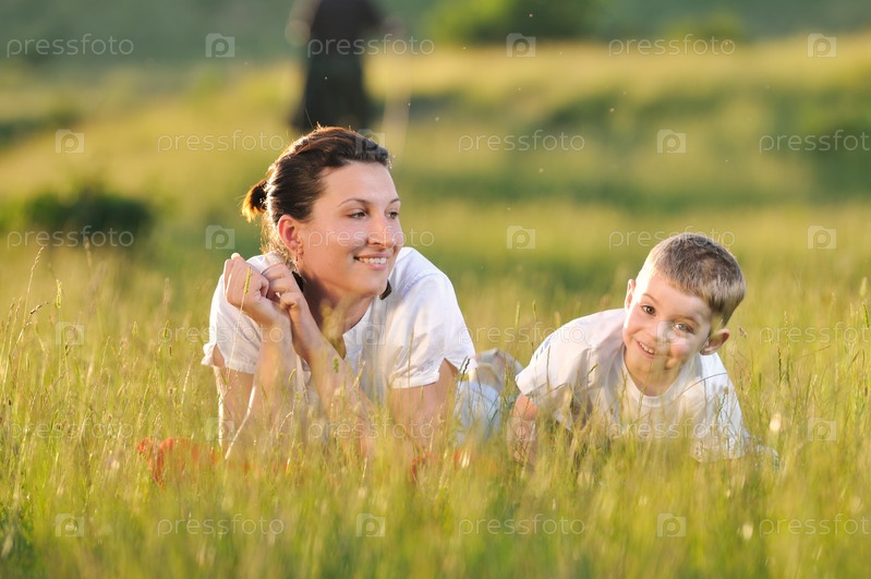 Счастливые ребенок и женщина отдыхают на лугу