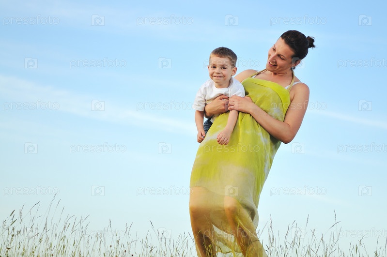 Счастливые ребенок и женщина отдыхают на лугу
