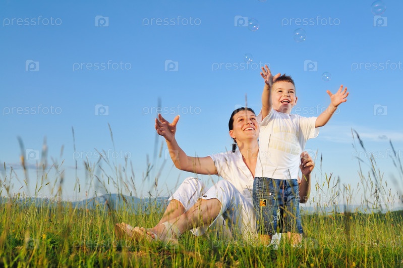 Счастливые ребенок и женщина пускают мыльные пузыри на лугу