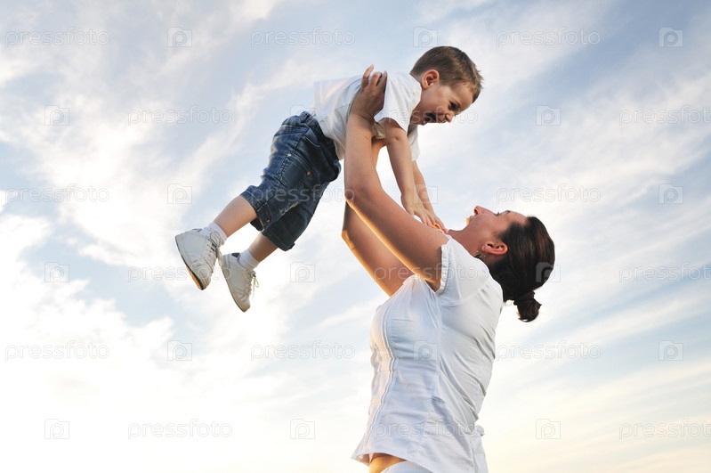 Счастливая мать играет с красивым ребенком на свежем воздухе