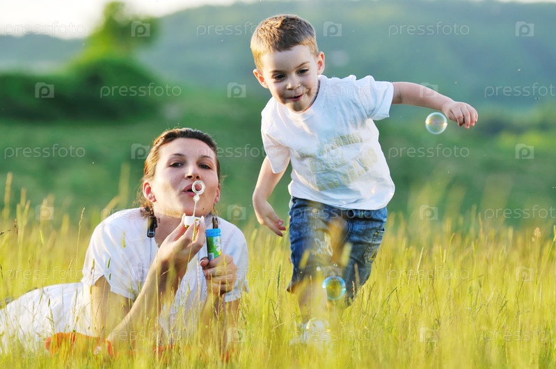 Счастливая мать играет с красивым ребенком на свежем воздухе