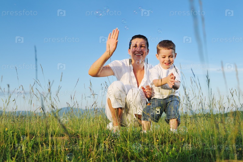 Счастливая мать играет с красивым ребенком на свежем воздухе