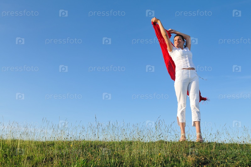 Красивая молодая и здоровая женщина бегает и прыгает с красным шарфом на лугу в солнечный день