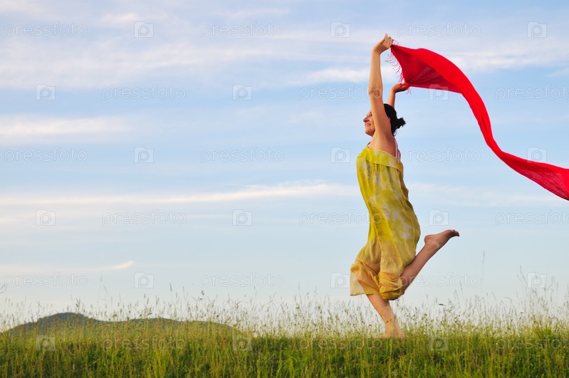 Красивая молодая и здоровая женщина бегает и прыгает с красным шарфом на лугу в солнечный день