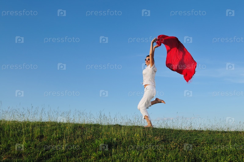 Красивая молодая и здоровая женщина бегает и прыгает с красным шарфом на лугу в солнечный день
