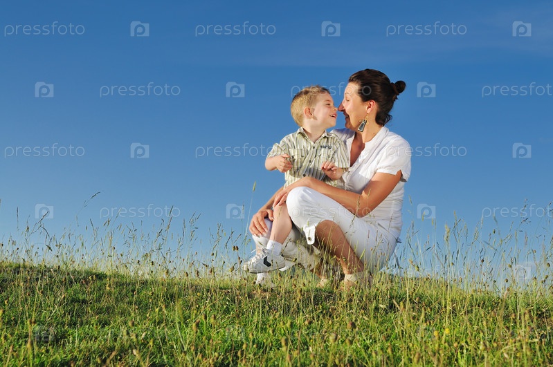 Счастливая мать играет с красивым ребенком на свежем воздухе