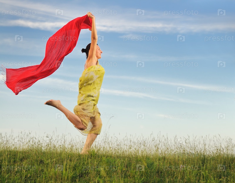Красивая молодая женщина с красным шарфом в руках бежит зеленому лугу