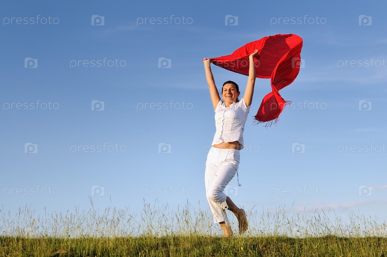 Красивая молодая женщина с красным шарфом в руках бежит зеленому лугу