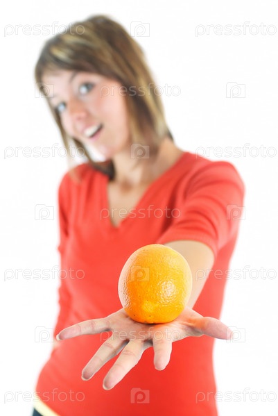 Счастливая женщина с апельсином в руке