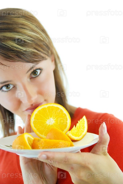 Молодая женщина с апельсином на тарелке