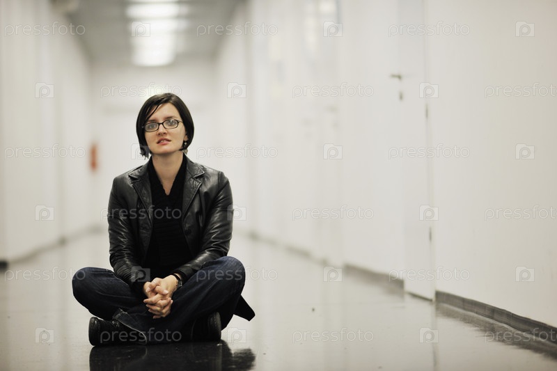 Молодая женщина в очках сидит на полу в коридоре