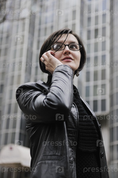 Молодая бизнес-леди в очках разговаривает по телефону на улице