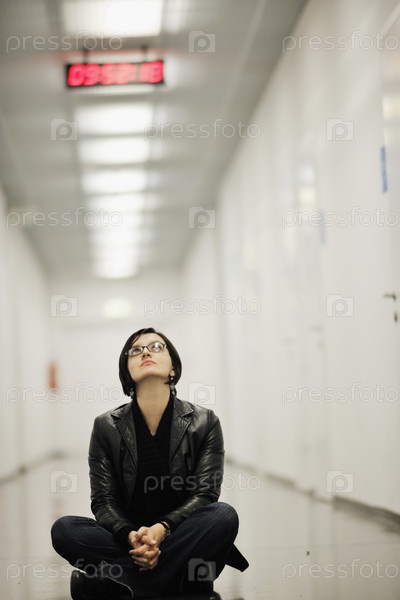 Молодая женщина сидит на полу в коридоре