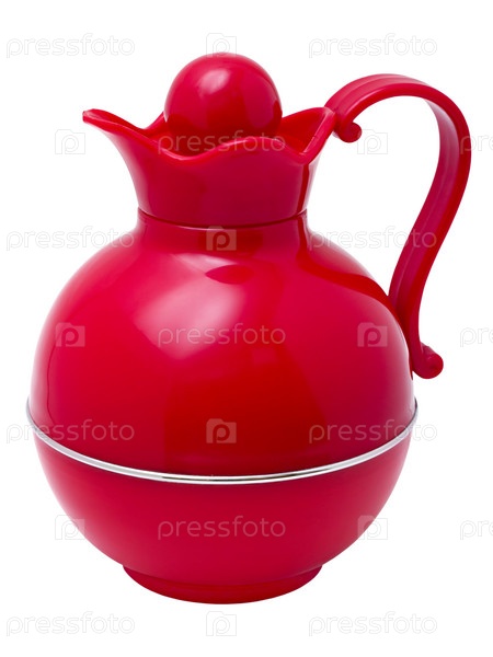 Красный пластиковый термос в форме кувшина, изолирован на белом фоне