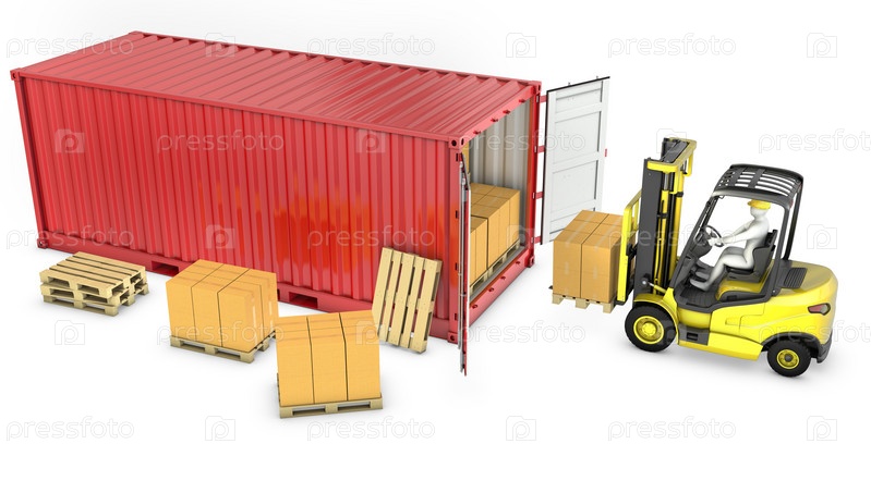 Желтый погрузчик разгружает красный контейнер, изолировано на белом фоне