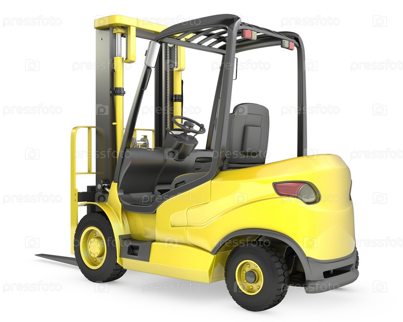 Желтый погрузчик, вид сзади, изолирован на белом фоне