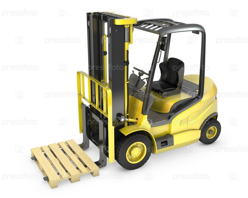 Желтый погрузчик с поддоном, изолирован на белом фоне