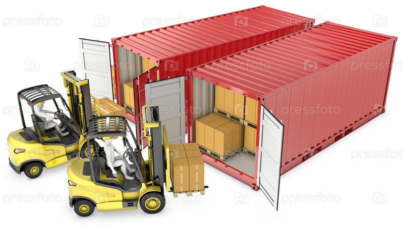 Желтый погрузчик разгружает красный контейнер, изолировано на белом фоне