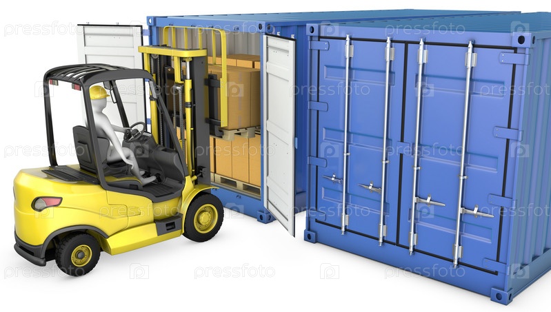 Желтый погрузчик разгружает контейнер, изолирован на белом фоне