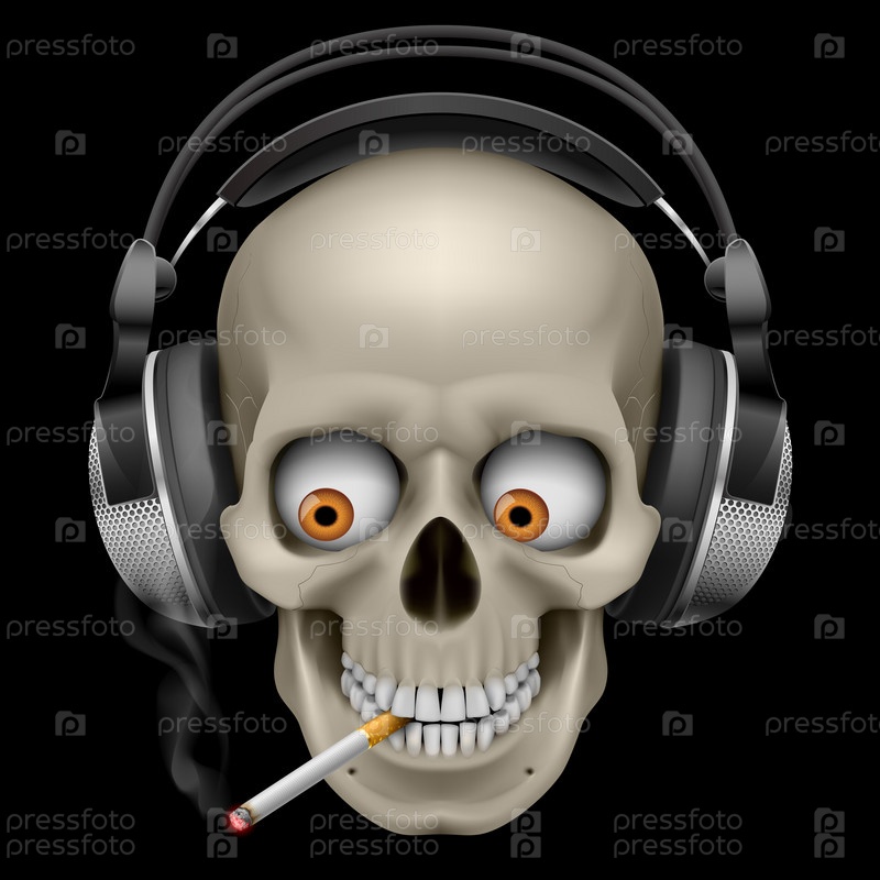 Череп в наушниках с сигаретой. Иллюстрация на черном фоне
