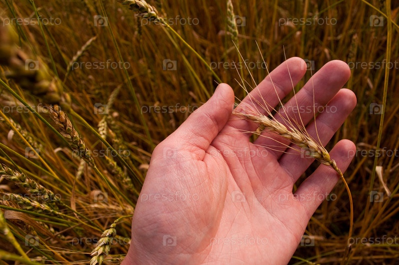 Зерно пшеницы в руке человека против поля