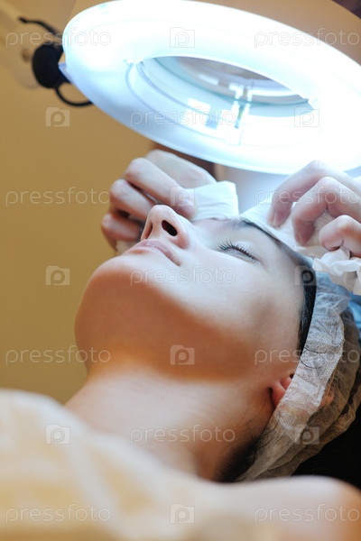 Женщина осуществляет уход за лицом в салоне красоты