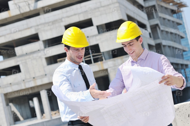 Архитектор и прораб проверяют документы на строительном объекте