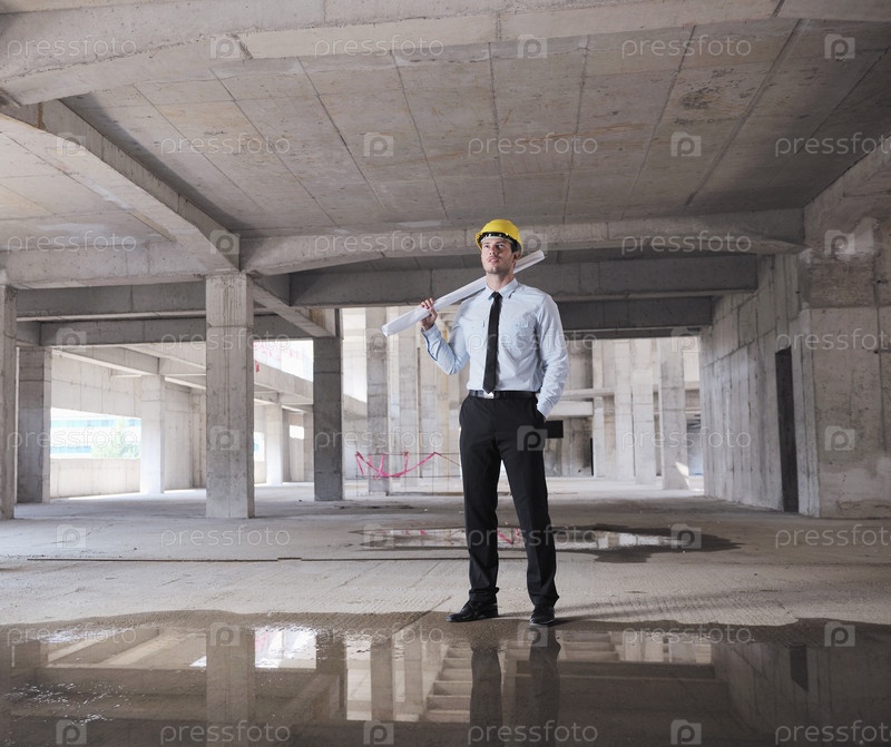 Молодой инженер на строительной площадке после дождя