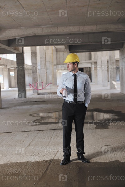Молодой инженер на строительной площадке после дождя