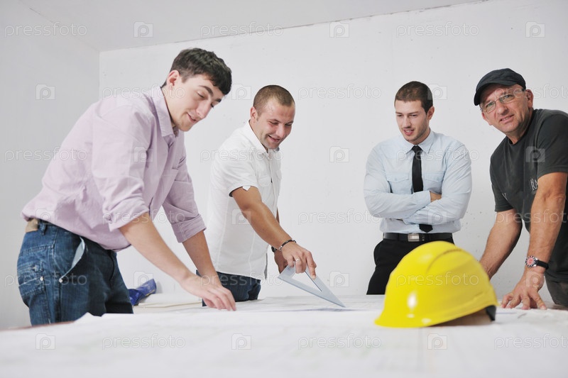Группа строителей и архитекторов обсуждают проект в офисе