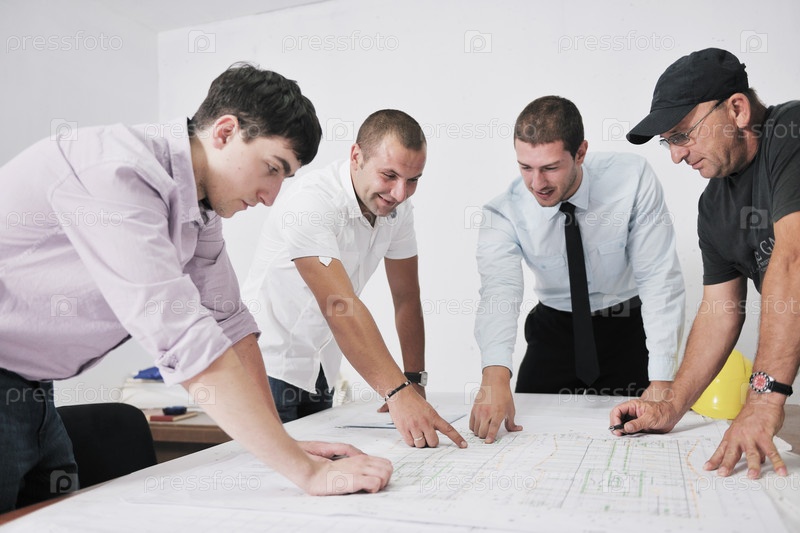 Группа строителей и архитекторов обсуждают проект в офисе