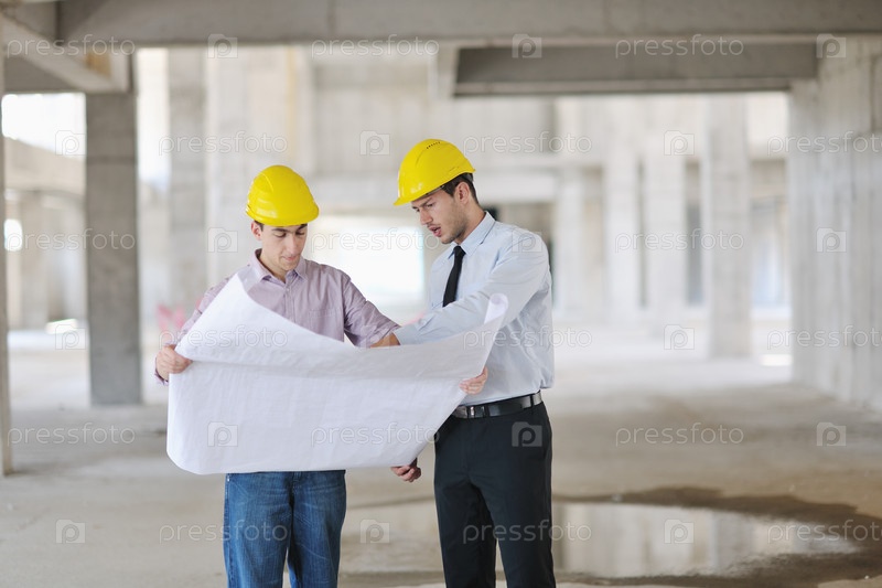 Архитектор и прораб проверяют документы на строительном объекте