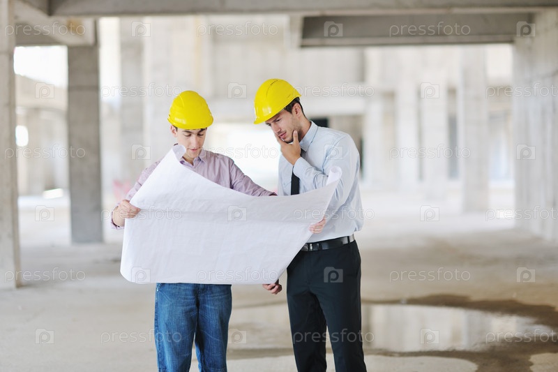 Архитектор и прораб проверяют документы на строительном объекте