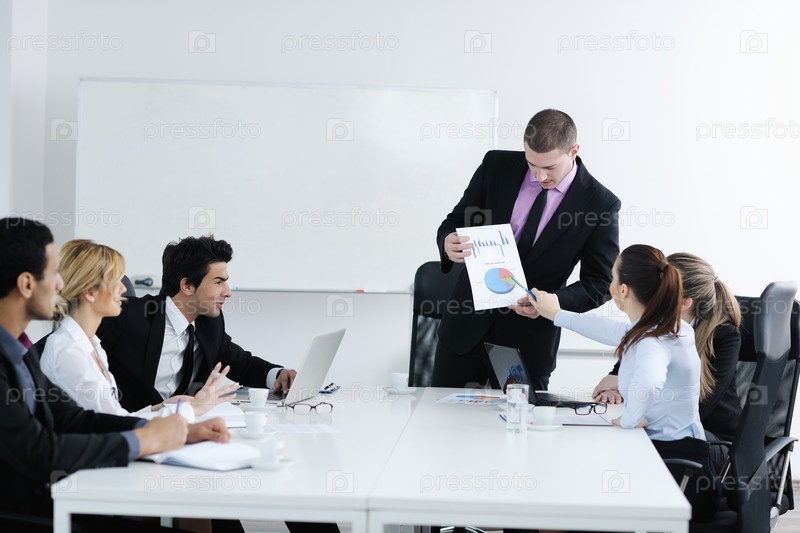 Группа молодых деловых людей обсуждает рабочие вопросы