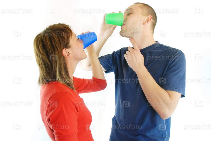 Счастливая семейная пара пьет из ярких стаканчиков