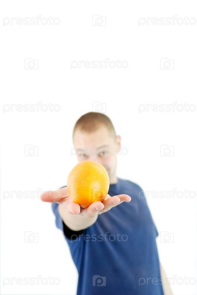 Молодой мужчина с апельсином в руке на белом фоне
