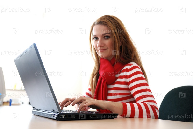 Молодая женщина в красном работает на ноутбуке в офисе
