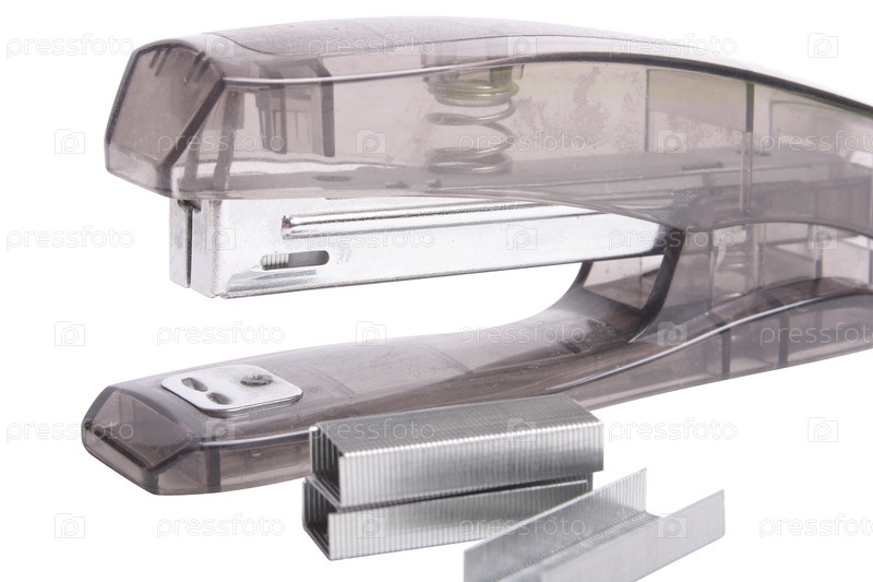 Степлер и металлические скрепки крупным планом на белом фоне