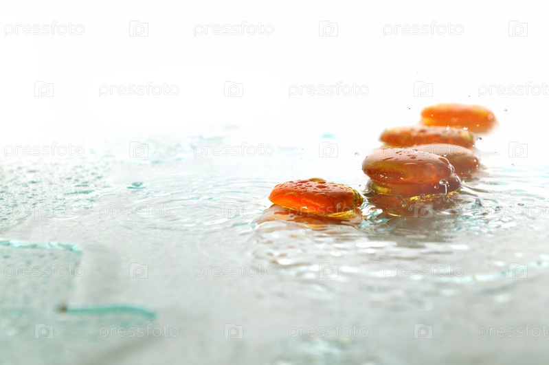 Влажные янтарные камни дзен на белом фоне
