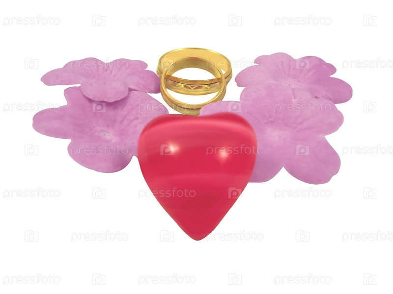 Свадебные кольца в фокусном фоне и размытое красное сердце на переднем плане окруженные цветы